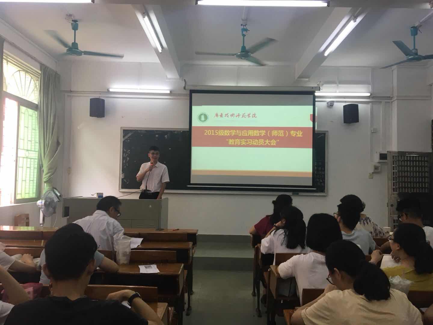 5月23日(周三)下午,数学与应用数学系在一教106为15数师两个班的同学举行了教育实习动员大会。伟德国际1946bv官网梁海华副经理、赵珲副书记、数学与应用数学系肖黎明主任和张淑玲老师、辅导员李秋老师参加了实习动员大会。会议由肖黎明主任主持。