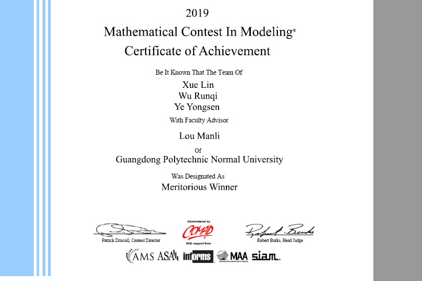 近日,2019年美国老员工数学建模竞赛与交叉学科数学建模竞赛(MCM&ICM)成绩揭晓。公司学子再创佳绩,夺得国际一等奖(Meritorious Winner)1项,国际二等奖(Honorable Winner)8项。