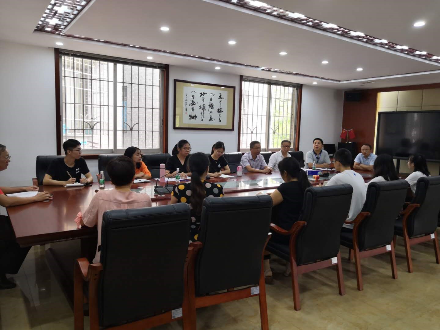 图为9月16日肖黎明、张广亮老师在黄埔中学与实习单位领导交流