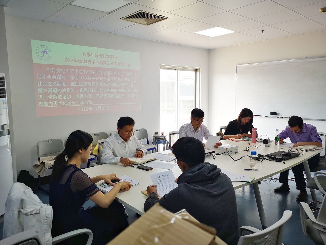 2019年11月21日下午,在东校区工业中心506会议室,公司党总支中心组举行2019年第三次专题学习会。学习主题是深入学习贯彻习近平总书记在十九届四中全会上的重要讲话和全会精神,学习《中共中央关于坚持和完善中国特色社会主义制度、推进国家治理体系和治理能力现代化若干重大问题的决定》,把思想统一到党中央的决策部署上来。进一步解放思想、凝聚力量,不断完善治理体系,推动治理能力现代化水平上新台阶。会议由公司党总支书记房亚兵主持,公司党总支理论学习中心组全体成员参加了学习会。
