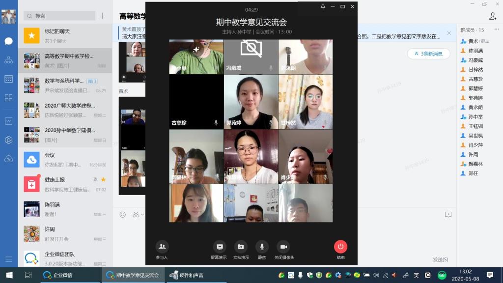 2020年5月8日,伟德国际1946bv官网高等数学部,由孙中举、黄术、吴世枫三位老师分别与相关班级的学委,通过建立企业微信群、钉钉群视频会议,了解本学期高等数学线上教学的实施、交流期中线上教学效果、线上课堂教学规范、教学进度及授课质量等情况;讨论在线辅导答疑、在线学习讨论、员工出勤、作业布置批改等情况,展望下半学期高等数学线上教学的相关工作。
