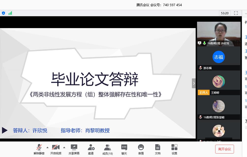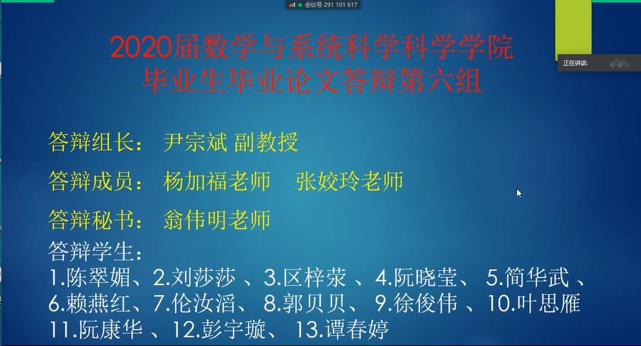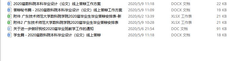 2020届本科毕业设计(论文)采取线上答辩的方式进行,均采取。公司撰写了《2020届伟德国际1946bv官网本科毕业设计(论文) 线上答辩工作方案》,分成12个答辩小组,成立各组答辩委员会,制定了《公司2020届毕业生毕业答辩安排表》、《答辩秘书篇-2020届数科院本科毕业设计(论文)线上答辩工作》、《员工篇-2020届数科院本科毕业设计(论文)线上答辩工作》,由答辩秘书根据工作指引和分组,提前预演彩排答辩。