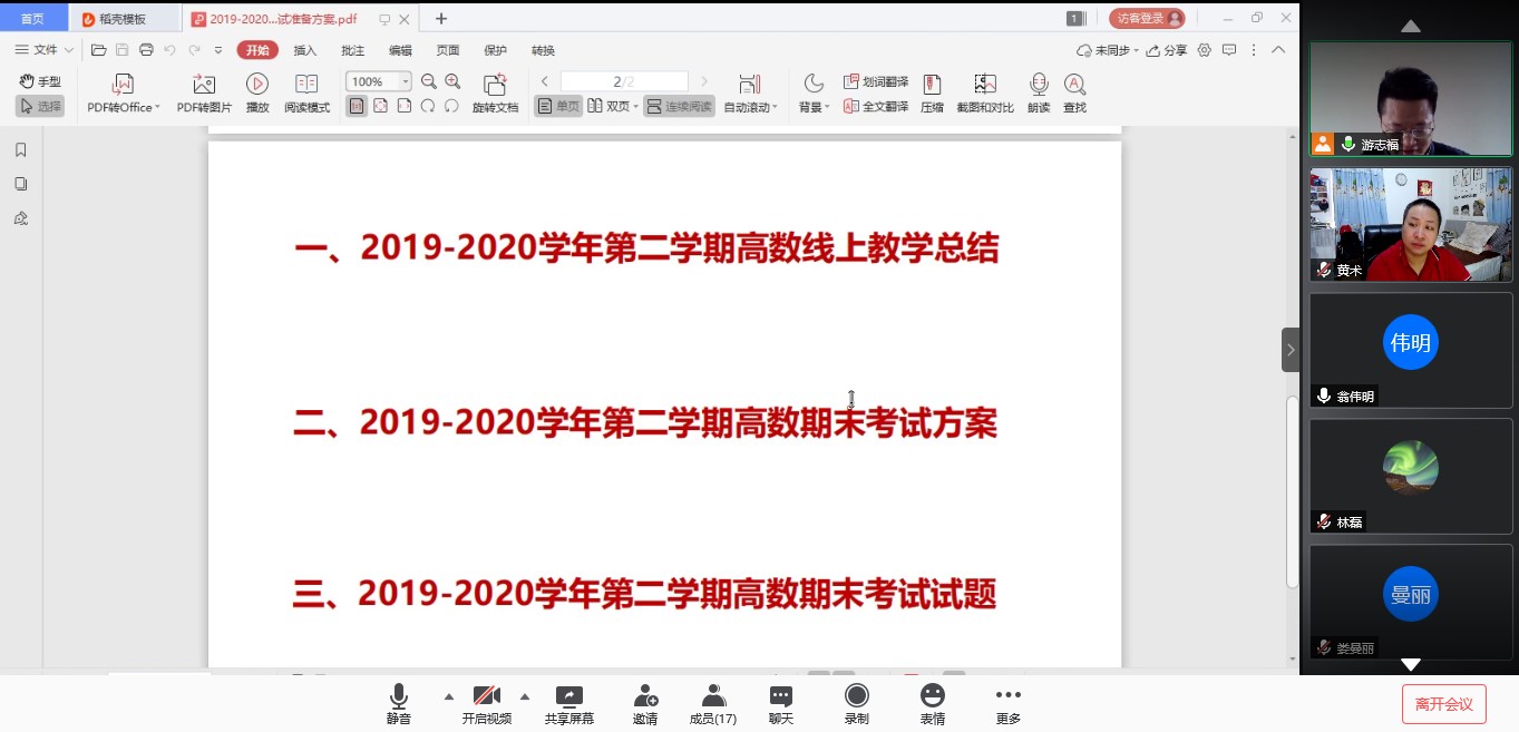 2020年7月10日,伟德国际1946bv官网高等数学部在腾讯会议,召开了2019-2020学年第二学期《高等数学》课程线上教学总结及期末考试准备方案会议。