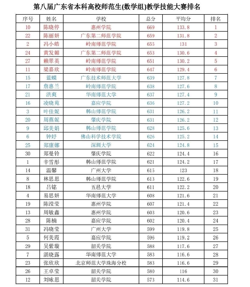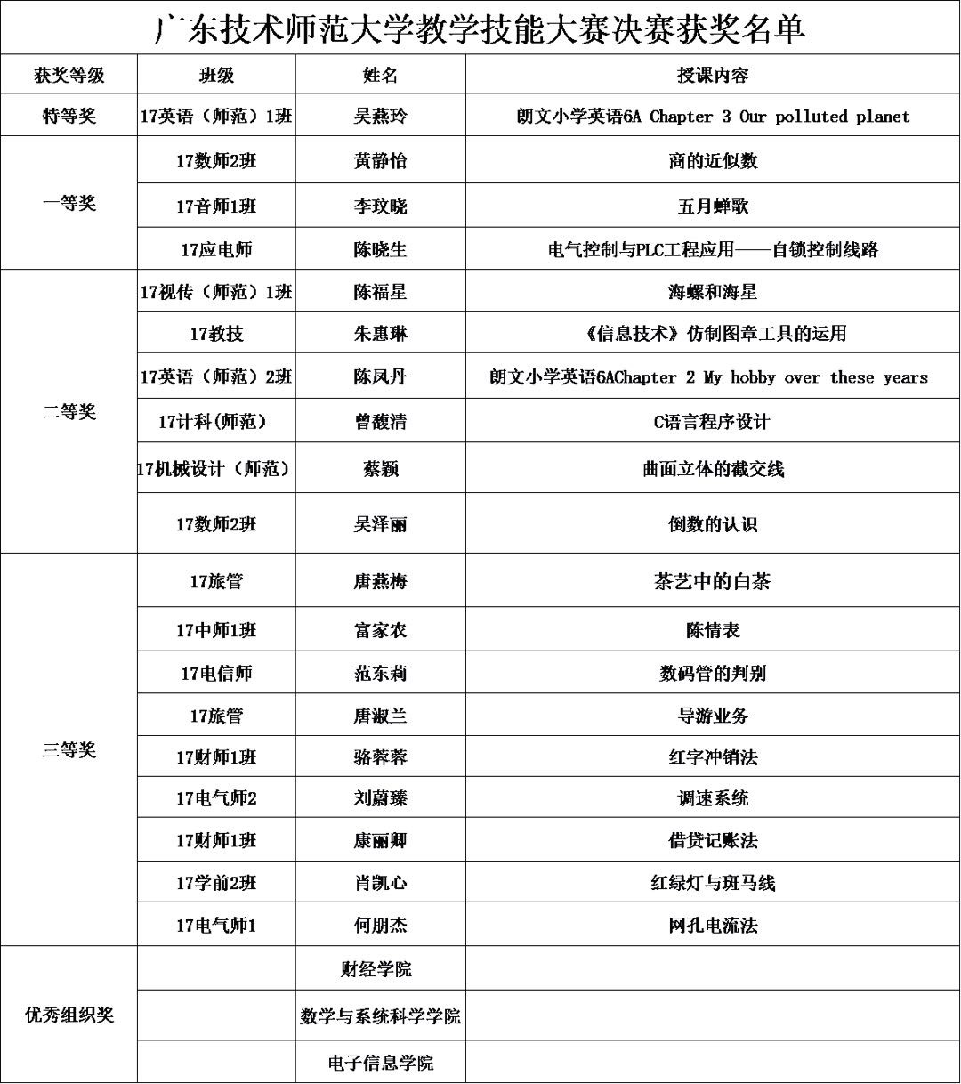 第八届广东省本科高校师范生教学技能大赛(数学组)10月24日在韩山师范公司举行。来自全省10多所高校的30多名选手通过选拔参加了现场决赛,公司2017级数师专业蓝蝶同学获得大赛二等奖,排名第7(指导教师:张淑玲)。