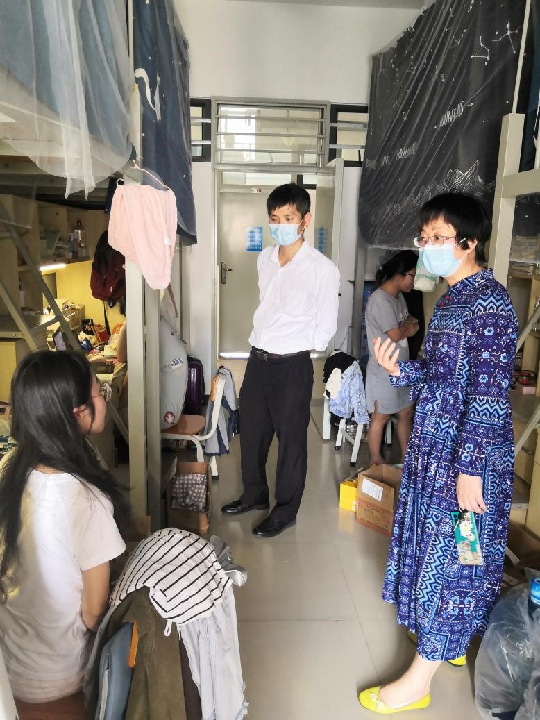 根据广州疫情防控工作的要求,保障师生身体健康和生命安全,白云校区本周开始线上教学。今天是线上教学开始的第一天,为深入了解员工疫情防控下的学习、生活情况,4月11日下午,公司白雪飞书记、梁海华经理、许国良副书记走访了在白云校区的研究生宿舍和19级部分本科生宿舍。