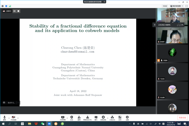 会议首先由陈楚荣老师给同学们做了题为“Stability of a fractional difference equation and its application to cobweb models”的学术报告,然后就实习、就业、考研等相关问题的和同学们进行了探讨。交流会中老师们解答上述相关问题,从而为同学们做好毕业前的规划提供了借鉴。通过本次交流会老师们更加深入地了解了2019级信息与计算科学专业同学们在学习与与实习中可能存在的问题,为接下来展开的“专业实习”提供了新的思路。
