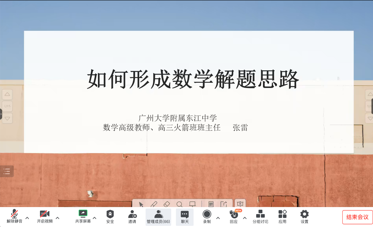 2023年4月16日上午,公司特邀广大附属东江中学数学高级教师、高三火箭班班主任张雷,为公司2020级、2021级数学与应用数学专业卓越教师班的员工作题为《如何形成数学解题思路》专题讲座,这是公司卓越教师班系列讲座之第一讲。本次讲座采用腾讯会议的形式进行,讲座由公司陈月红副经理主持,数学与应用数学专业卓越班全体导师、辅导员张洪扬等多位教师以及卓越班全体员工共同参加。