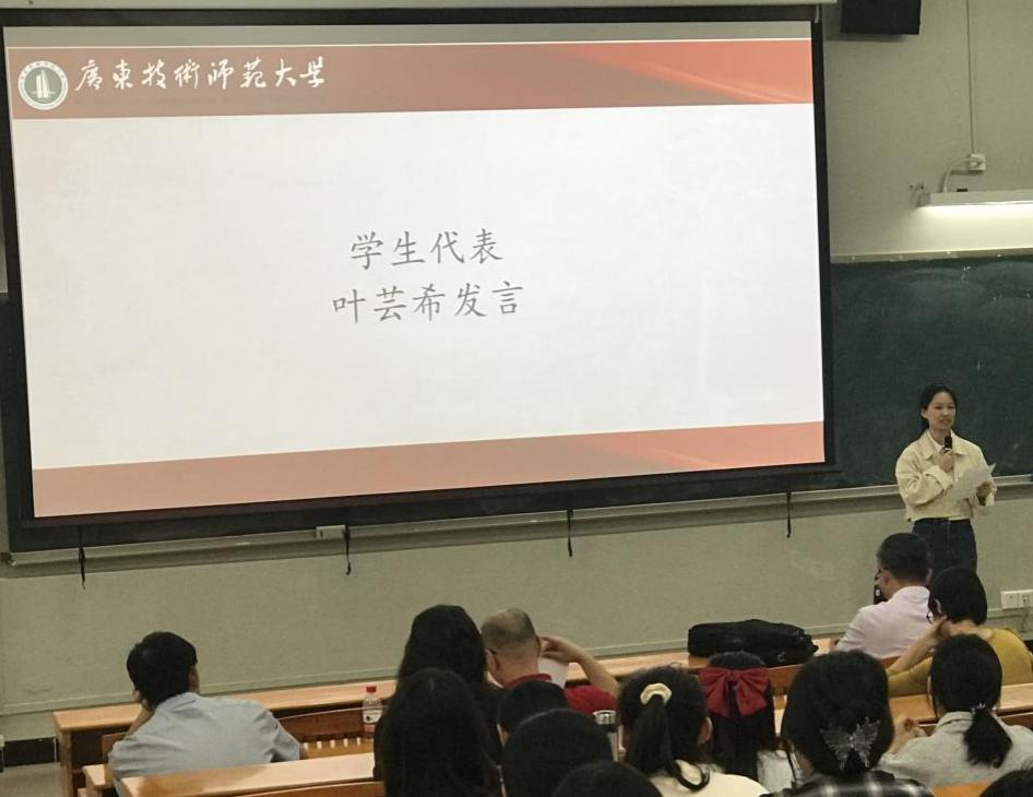 员工代表叶芸希发言。她分享了自己开学以来在卓越班学习的经历与体会,表示在这一过程中进一步明确了师范技能对师范生未来成长道路的重要性;最后她代表所有同学对导师们接下来的付出表示感谢,表达了22级数师卓越班全体同学对新导师的期待和对即将开始的学术旅程的憧憬。
