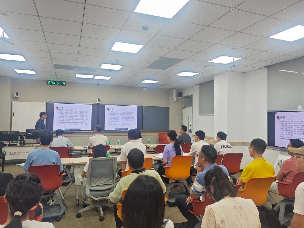 赖虹建教授围绕“多彩染色问题如何从解决供电网络的最优重置中的代理网络通讯问题中产生,图论中多彩颜色问题近年的发展和一些继续研究的问题”,以“船用供配电网络的自我优化修复问题、自我优化修复和无中心处理器的最大流算法、代理(Agent)和多代理系统(Multi-Agent System或MAS) 介绍、多代理系统的通信数学模型 :多彩染色问题的引入”为主要内容,从研究缘起、研究思路、研究过程以及数学如何介入相关应用问题作了详细阐述。赖教授鼓励师生们一定要激活、用好“数学好奇心”,用好奇心感受数学魅力、遨游数学海洋、挑战数学奥秘。与会人员与赖教授进行了深入交流探讨。