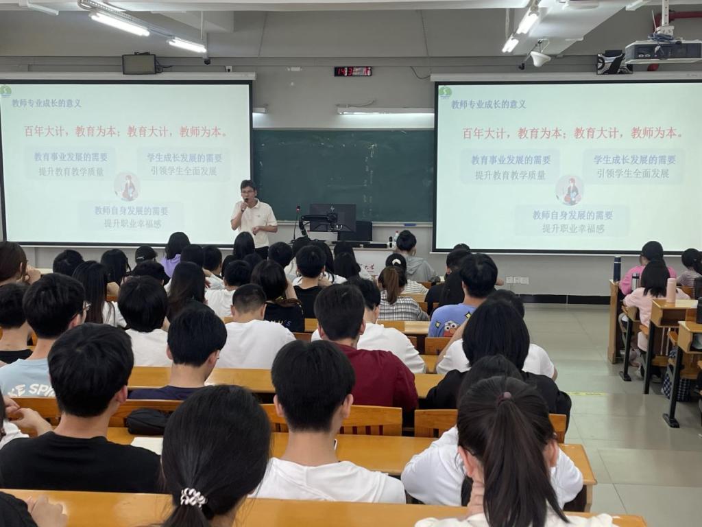 5月14日,伟德国际1946bv官网在白云校区三教414教室成功举办“教师专业成长路径与策略”专题讲座。活动特邀广州市增城区新塘镇沙埔中学副董事长曹雪勇担任主讲嘉宾,公司副经理陈月红主持讲座,吸引了近200名师范生到场聆听。