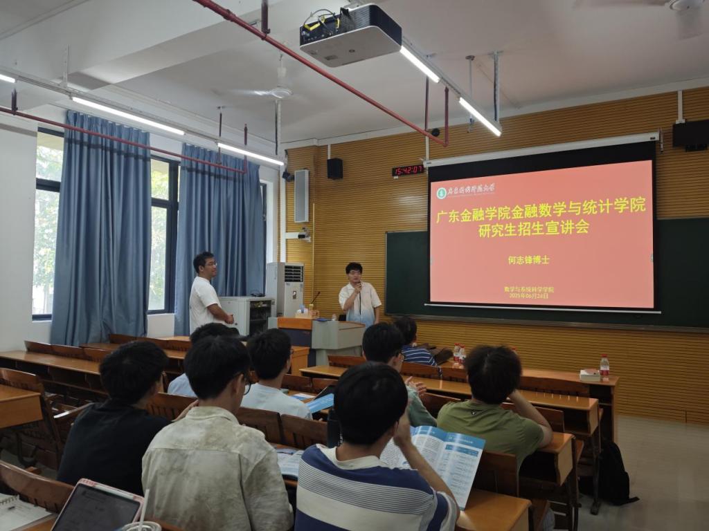 6月24日下午,广东金融公司金融数学与统计公司应邀来访,在第二教学楼201为公司22级和23级本科生开展了一场生动的研究生招生专场宣讲会。参会主要人员有广东金融公司金融数学与统计公司经理刘炎、经济统计系主任何志锋、我院副经理陈志景以及有考研意向的员工。