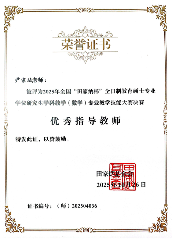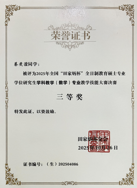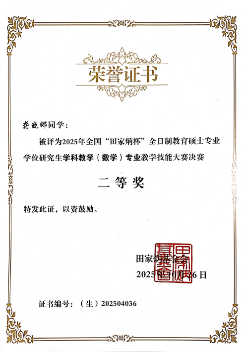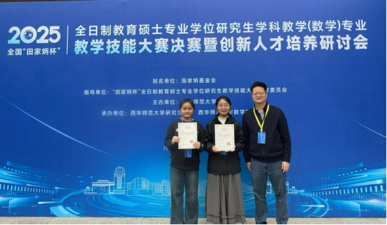 10月26日,2025年全国“田家炳杯”全日制教育硕士专业学位研究生学科教学(数学)专业教学技能大赛决赛在四川省南充市西华师范大学落下帷幕。我院2023级学科教学(数学)专业研究生龚晓娜、蔡荧滢两位同学由游志福教授带队,在全国113所高校选派的280名选手中脱颖而出,分别荣获二等奖和三等奖。尹宗斌老师获得优秀指导老师称号。