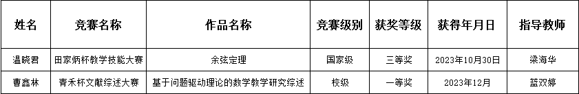 根据《关于开展2023年bevictor1946韦德官网研究生优秀学科竞赛奖励评审工作的通知》(广师大研〔2024〕8号),经公司硕士研究生导师评审会议讨论通过。拟上报2021级温晓君、2022级曹鑫林参选。现予以公示: