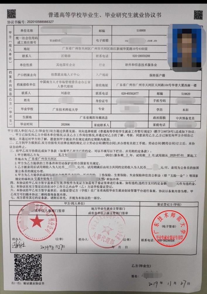 2.2020年起更改为线上申请电子就业协议书:往年,全国均采用纸质版就业协议书,一份协议书共白粉黄绿色四联,经毕业生、用人单位签署后生效,公司为鉴证登记方。自2020届毕业生起,广东省上线“电子就业协议书”,就业协议书的申请和签订均改为“广东老员工就业创业”微信公众号内线上进行。