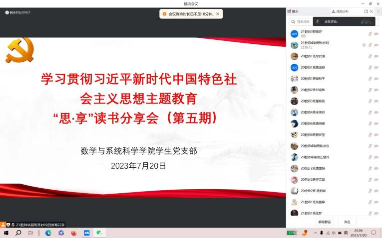 为深入开展学习贯彻习近平新时代中国特色社会主义思想主题教育工作会议精神,学习领会党的二十大精神,通过读原著、学原文、悟原理,在行动上以学铸魂、以学增智、以学正风、以学促干,7月20日晚上,​伟德国际1946bv官网通过腾讯会议开展学习贯彻习近平新时代中国特色社会主义思想主题教育“思•享”读书分享会(第五期)。员工党支部书记王婷婷、全体员工党员参加了本次读书分享会。