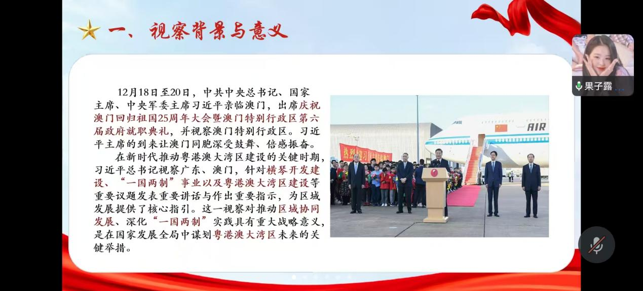 会上,全体党员共同学习习近平总书记视察广东、澳门重要讲话和重要指示精神。员工党员郭依璐作为党员代表分享学习心得。