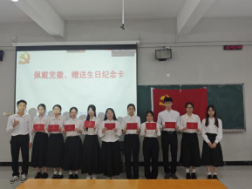 在新党员入党宣誓暨“政治生日”活动环节中,全体党员重温入党誓词,由本科生党支部支部委员黄泽佳领誓,为新党员佩戴党徽并赠送政治生日纪念卡。正式党员代表王泓程、张碧怡、郭依璐等依次向预备党员送出政治生日祝愿,预备党员代表徐铭朗、肖欣仪分别发表政治生日感言。本科生党支部书记刘敏赠与政治生日寄语。
