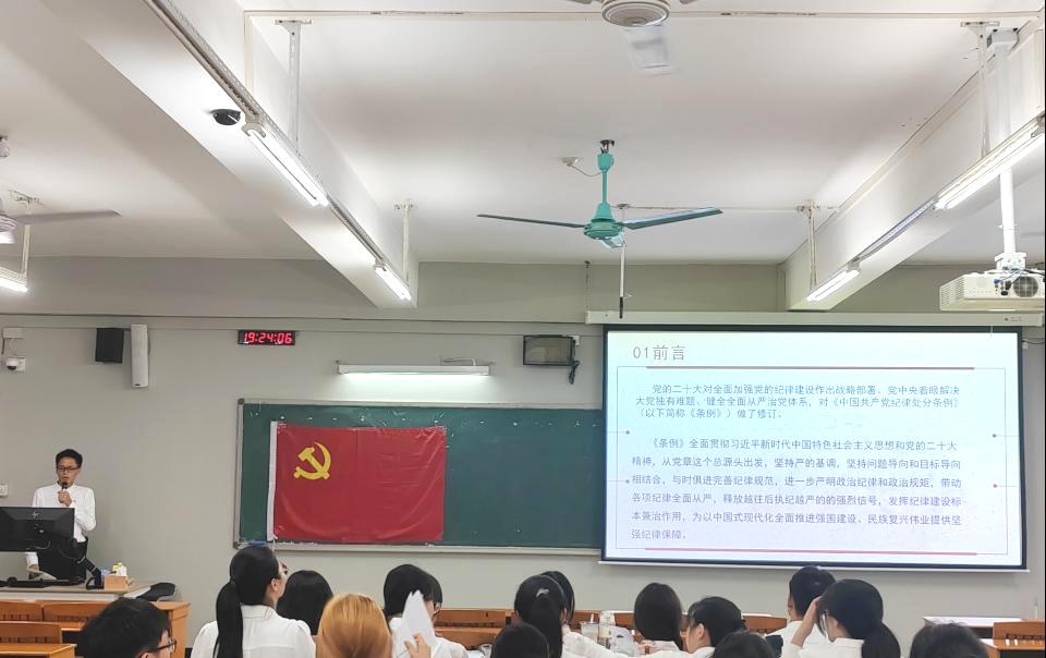 会上,全体党员集体进行党纪教育学习,共同学习主题——学好用好条例,持续正风肃纪,党员代表黄泽佳分享学习心得。