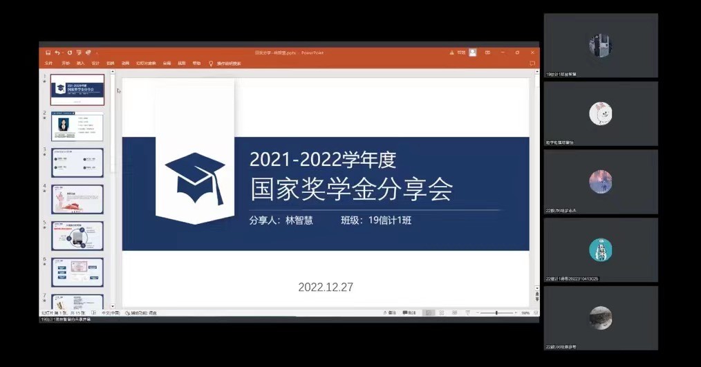 为进一步加强学风建设,营造良好的学习氛围,12月27日数科院开展主题为“对话国奖,踔厉奋发”的国家奖学金获得者经验分享交流会,邀请了林智慧与宋美玲2位国奖获得者作经验分享,295名2022级员工参会,会议由助学助理邓慧怡主持。