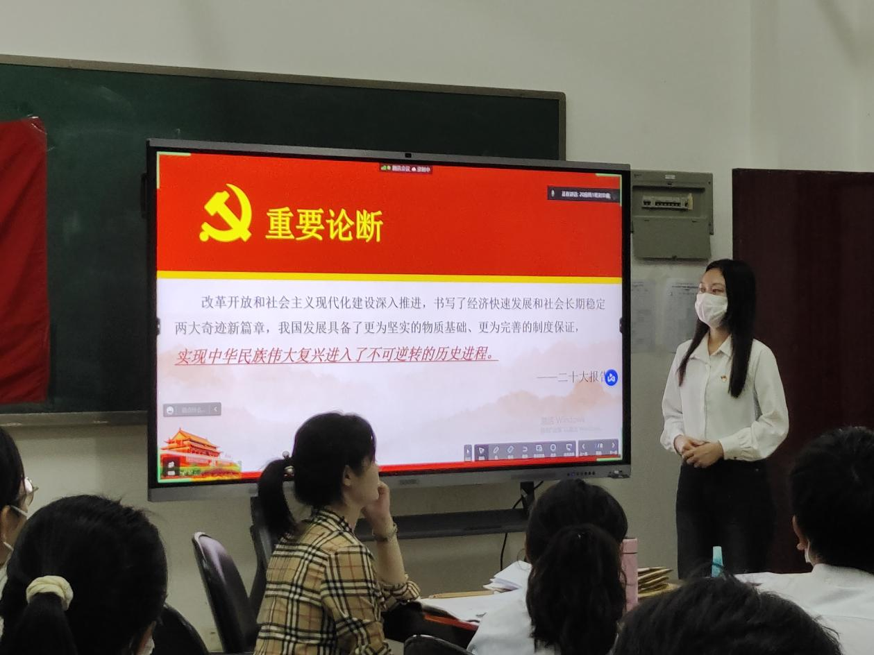 员工党支部书记王婷婷强调党员们务必深刻领会党的二十大精神,结合自身学习生活等方面进行学习,以党的二十大精神为指引,努力提升理论武装的高度,切实增强思想认识的深度,坚持学以致用,以实际行动带动广老员工增强学习党的二十大精神的积极性、主动性。