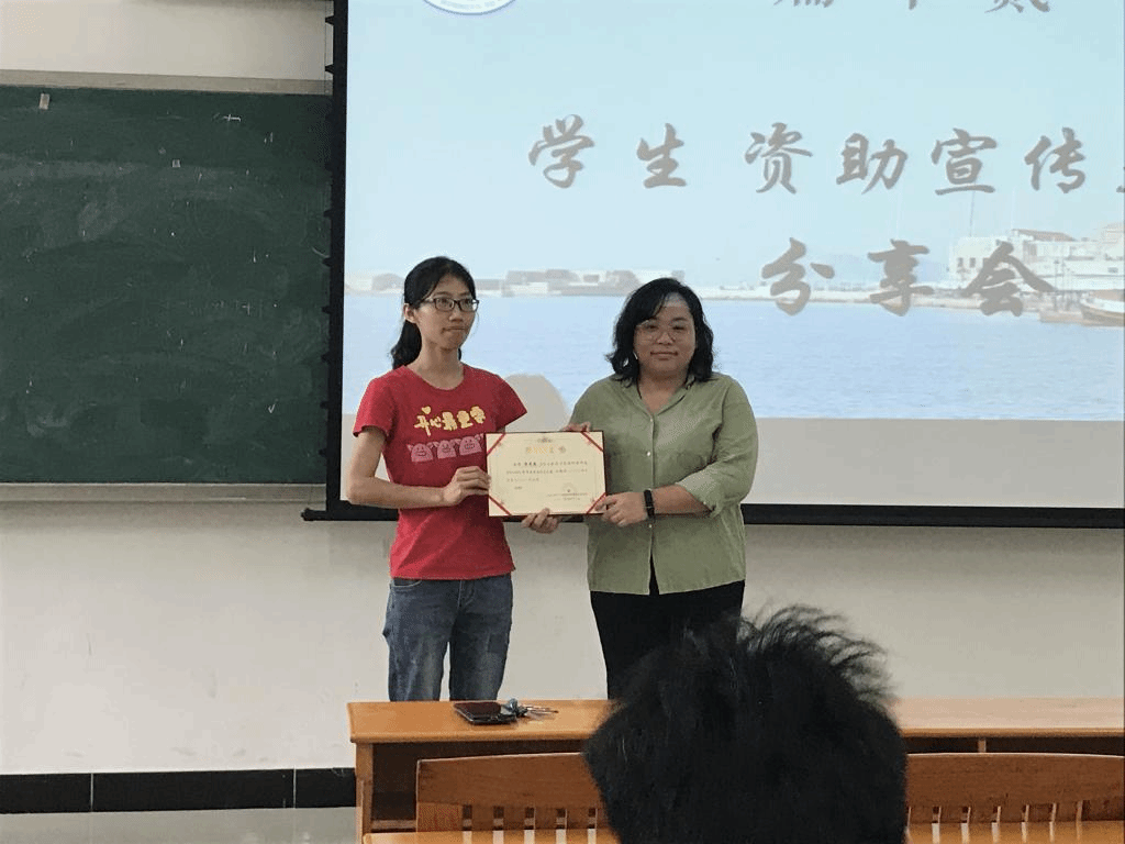 在会上,黄惠婷老师为陈奕霞同学颁发了​伟德国际1946bv官网资助宣传大使聘书。随后,陈奕霞同学给大家分享了日常生活以及学习上的一些经验,陈奕霞同学不仅注重个人专业知识的学习,还注重个人实践能力的培养。她积极参加校内外各种比赛和实践活动,在比赛中学习和成长。此外,陈奕霞同学还表示,没有国家的资助政策,也就没有现在的她,我们应该始终对公司和国家怀有感恩之心,不忘初心,砥砺前行。